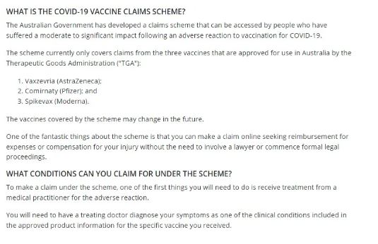 The scheme currently only covers claims from the three vaccines that are approved for use in Australia by the Therapeutic Goods Administration (“TGA”):