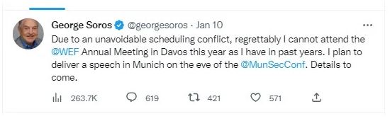 George Soros: Due to an unavoidable scheduling conflict, regrettably I cannot attend the WEF Annual Meeting in Davos this year as I have in past years. I plan to deliver a speech in Munich on the eve of the Munich Security Conference in February.