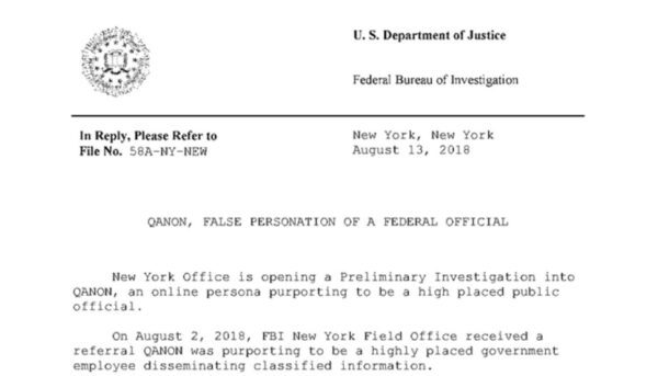 The FBI’s Field Office in New York launched an investigation into QAnon in August of 2018 after they received a tip that claimed “QAnon was purporting to be a highly placed government employee disseminating classified information.”