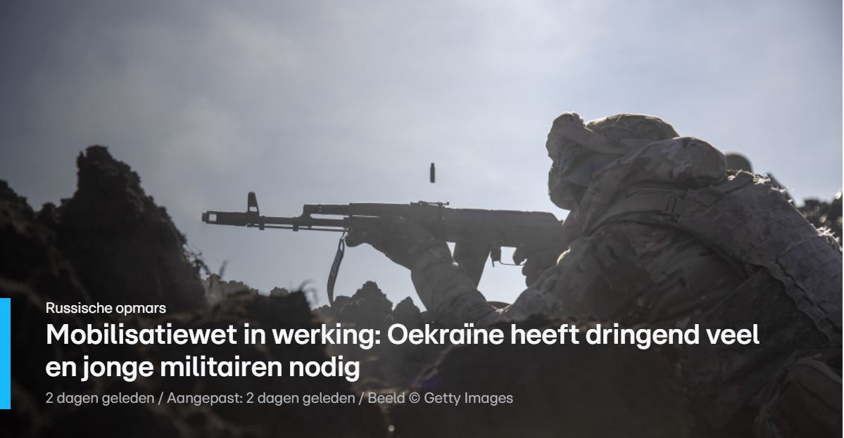 "De mobilisatie is acuut, vanwege de Russische opmars", zegt onze verslaggever in Oekraïne, Chris Colijn. "Oekraïne heeft dringend wapens nodig. Die komen eraan, nu Amerika toch dat miljardensteunpakket heeft toegezegd. En ook de beloofde F16's verwachten ze hier de komende tijd binnen te krijgen. Maar je hebt natuurlijk ook mensen nodig om die wapens te bedienen. En om te vechten."