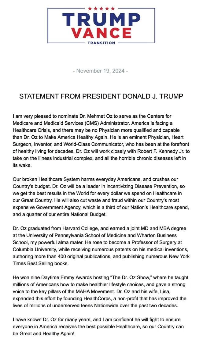 Re: DR OZ as the Centers for Medicare and Medicaid Services (CMS) Administrator: