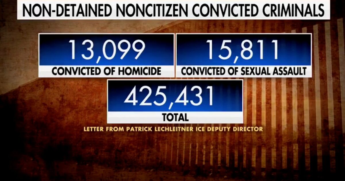 So, keep that in mind—this non-detained docket. According to a letter that the acting director of ICE just sent to Texas Congressman Tony Gonzalez, on ICE’s non-detained docket, they’re currently tracking 425,000 non-citizens who have been convicted of a crime.