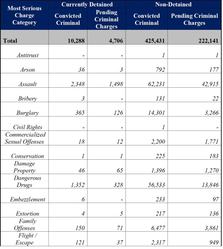 Of that, 425,000 have already been convicted of crimes, and 222,000 are pending crimes. Again, the most serious crimes we just told you about: over 13,000 convicted of homicide, over 15,000 convicted of sexual assault.