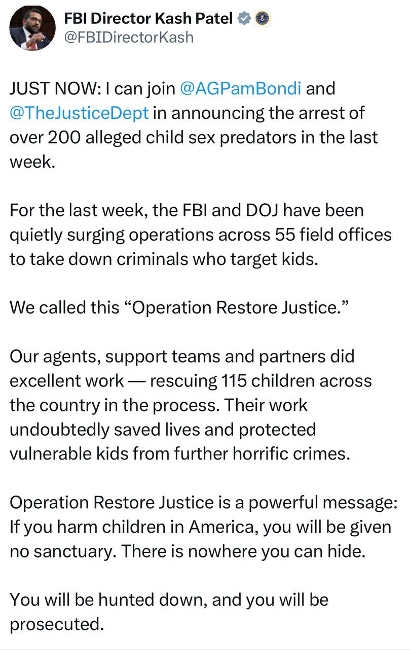 Kash and Bondi just arrested 200+ alleged child predators in the last week, as part of an ongoing operation called “Operation Restore Justice.”