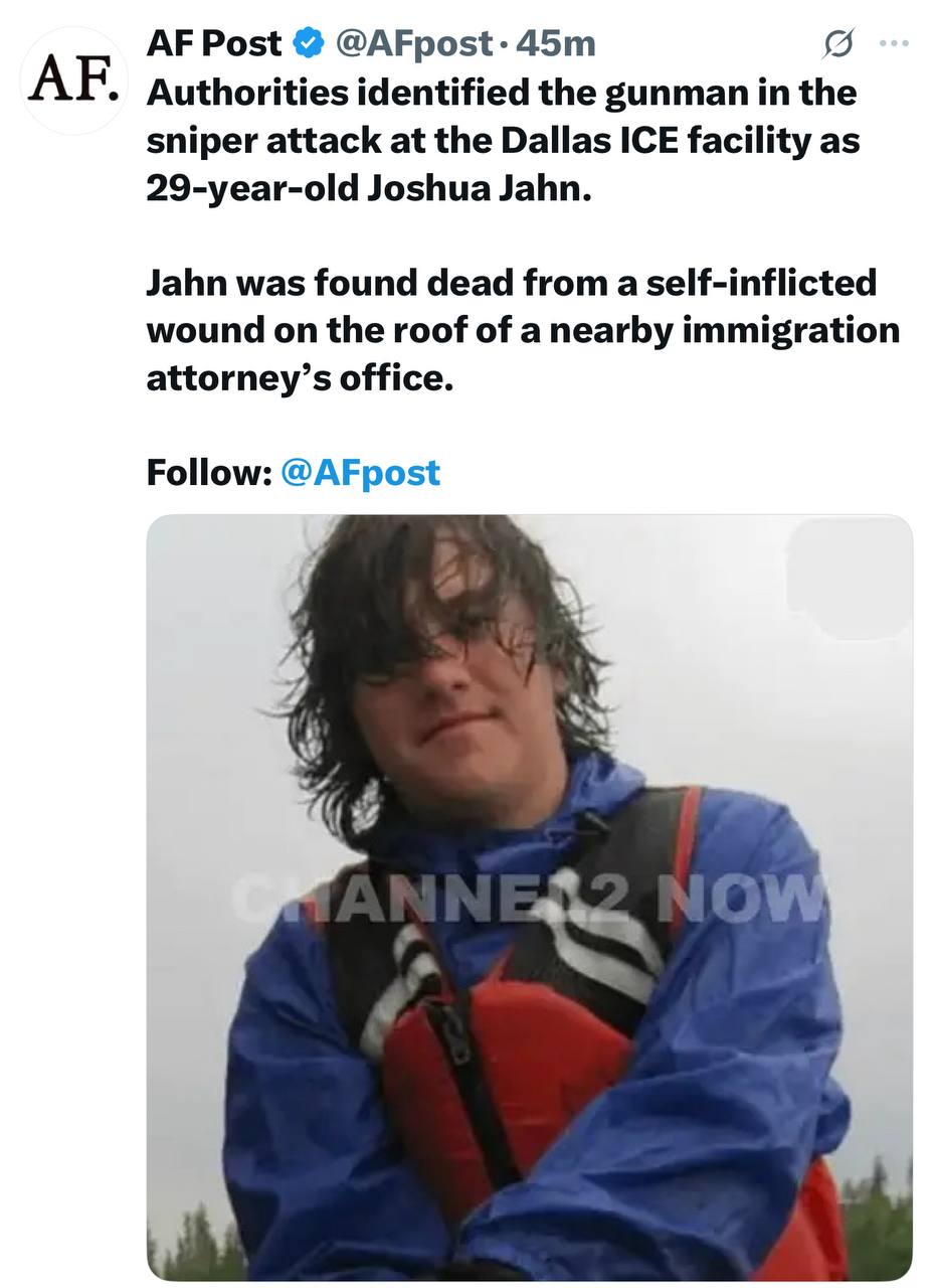 NBC News reports Joshua Jahn, the 29-year-old Dallas ICE facility shooter, was described by his brother Noah as apolitical and not strongly opinionated about ICE. Jahn, an unemployed coder and independent voter with a 2016 marijuana delivery conviction, was planning to move to his parents’ Oklahoma property. Noah, shocked by the attack, said Jahn wasn’t a skilled marksman but knew how to use their parents’ rifle.