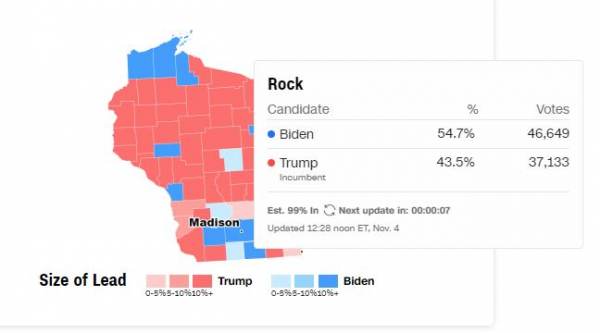 Currently the race in Wisconsin is showing Biden with a lead of 1,630,570 votes to President Trump’s 1,610,030 votes. When this adjustment is confirmed Biden will only hold a 1,508 vote lead.