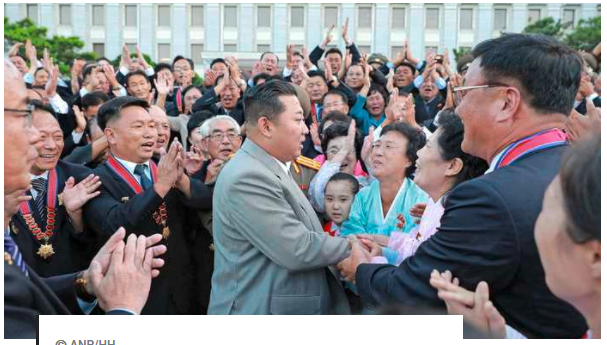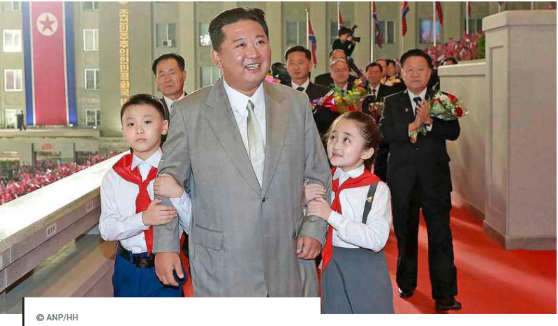 Kim nam het woord woensdag niet, maar was schijnbaar goedgehumeurd. Hij gaf de deelnemers aan de parade duimpjes en kuste de kinderen die hem bloemen kwamen geven.