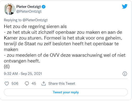 Hij roept het demissionaire kabinet verder op om het stuk ook aan de Kamer te sturen. "Formeel is het stuk voor ons geheim, terwijl de Staat nu zelf besloten heeft het openbaar te maken", schrijft Omtzigt.