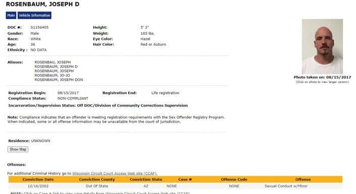 We asked the Wisconsin Department of Corrections if they had a Joseph Rosenbaum on the registry before and they said yes, and they were notified he’s now deceased. That’s why he no longer appears on the registry. See their response to us here: