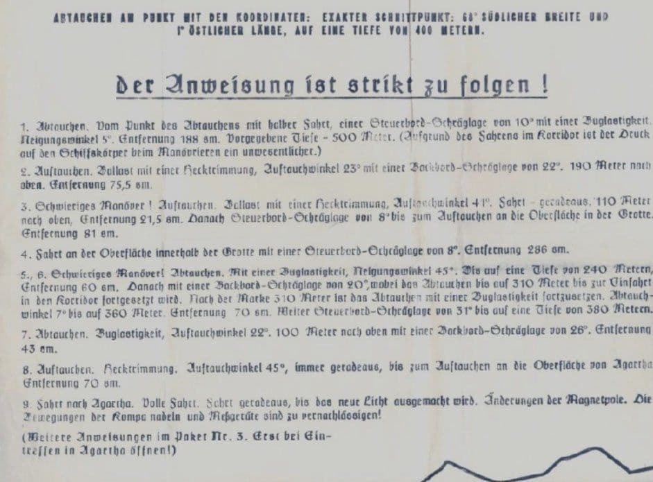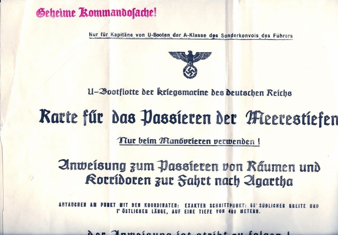 Very interesting documents sent in from our member Rickyleaks who's grandfather was in the SS and first officer of a Submarine. Documents passed down to him. The document title says Map for passing the sea depths. Instructions for passing rooms and corridors to Agartha. At the end it says: in danger of burning first, sincerely Der Führer. What do you think?