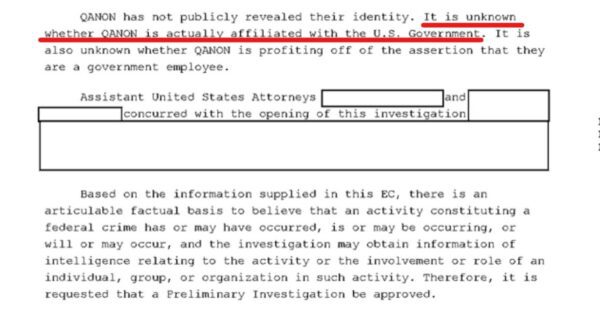 FBI agents said in the unclassified records when the investigation was opened that the anonymous person behind QAnon “has not publicly revealed their identity” and that “it is unknown whether QAnon is actually affiliated with the US Government.”