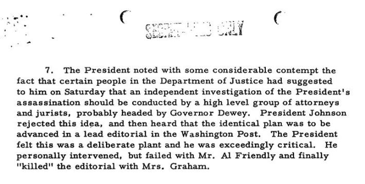 In other parts of the same unclassified file, Johnson turned down a request from the Department of Justice suggesting Johnson to allow an independent panel of lawyers and jurists to investigate Kennedy’s assassination.