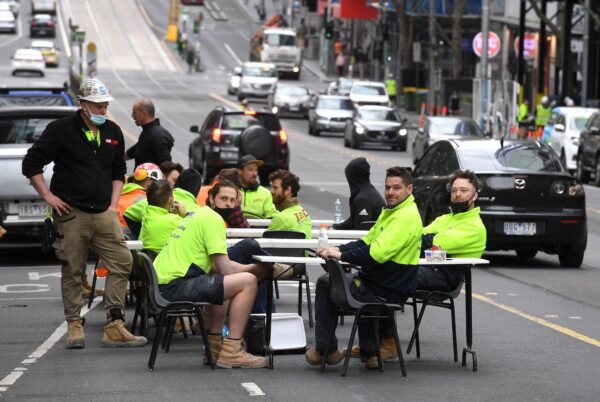 Construction workers take their lunch break on a busy street in Melbourne, to protest the closing of their onsite tea rooms by the state government, on Sept. 17, 2021. (William West/AFP via Getty Images)