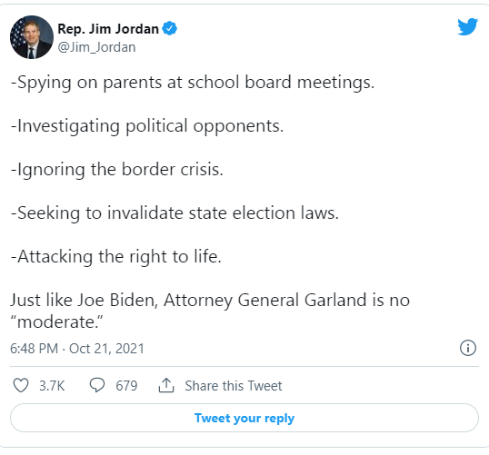 “March 25th, Joe Biden criticizes the Georgia election law, three months later the Department of Justice challenges it,” Jordan noted. “September 1st, Joe Biden criticizes the new pro-life law in Texas, eight days later the Department of Justice challenges it. September 29th, a political organization asks President Biden to involve the FBI in local school board issues, five days later Department of Justice does just that.”