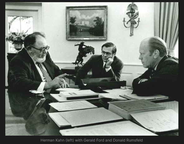 In 1968, Herman Kahn would be asked by a reporter what they do at the Hudson Institute. He would say, “We take God’s view. The President’s view. Big. Aerial. Global. Galactic. Ethereal. Spatial. Overall. Megalomania is the standard occupational hazard.” This was reportedly followed by Herman Kahn rising out of his chair, pointing his finger towards the sky and suddenly shouting out: ‘Megalomania, zoom!'”