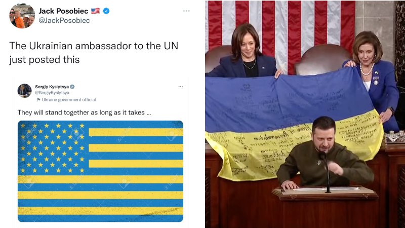The Ukranian ambassador to the UN on Thursday posted an image of the US flag decked out in the yellow and blue colors of Ukraine, along with the caption "They will stand together as long as it takes."