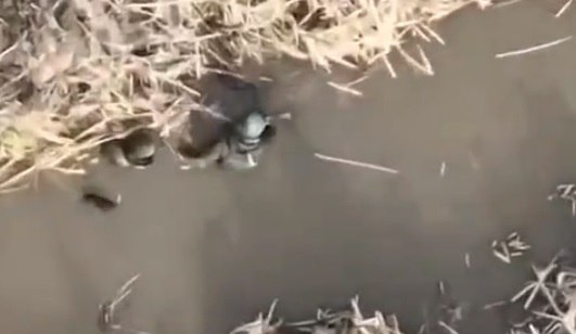 The second video (disturbing, viewer discretion is advised) shows the use of two munition-carrying drones against two soldiers, presumably Russian, who are walking waist-deep in a water-filled ditch.